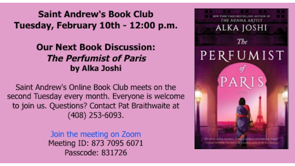 Saint Andrew's Online Book Club meets on the second Tuesday every month. Everyone is welcome to join us. Questions? Contact Pat Braithwaite at (408) 253-6093. Join the meeting...